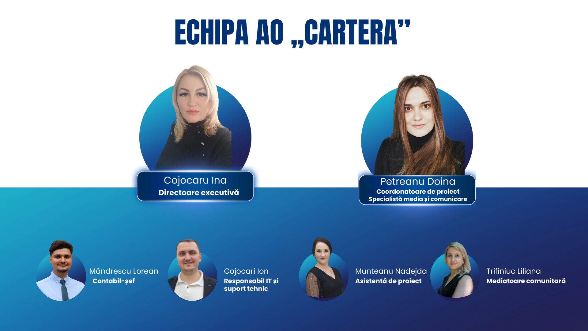 Echipa CARTERA reunește profesioniști din diverse domenii – educație, psihologie, drept și management de proiect – cu o vastă experiență în lucrul cu comunități, tineri, femei și grupuri vulnerabile.
